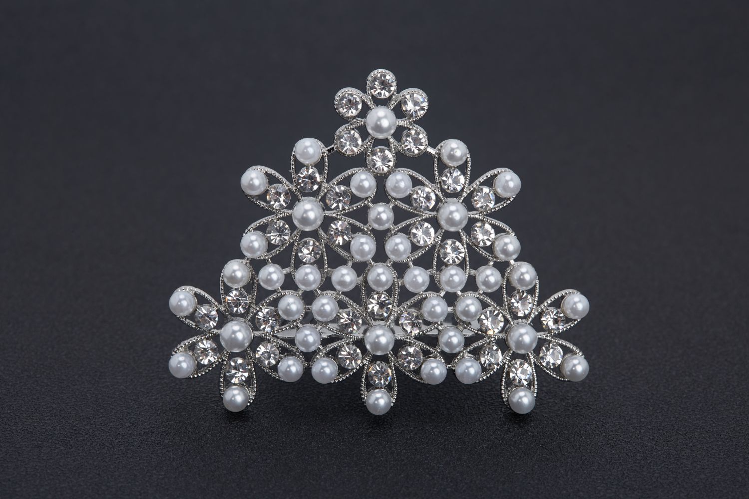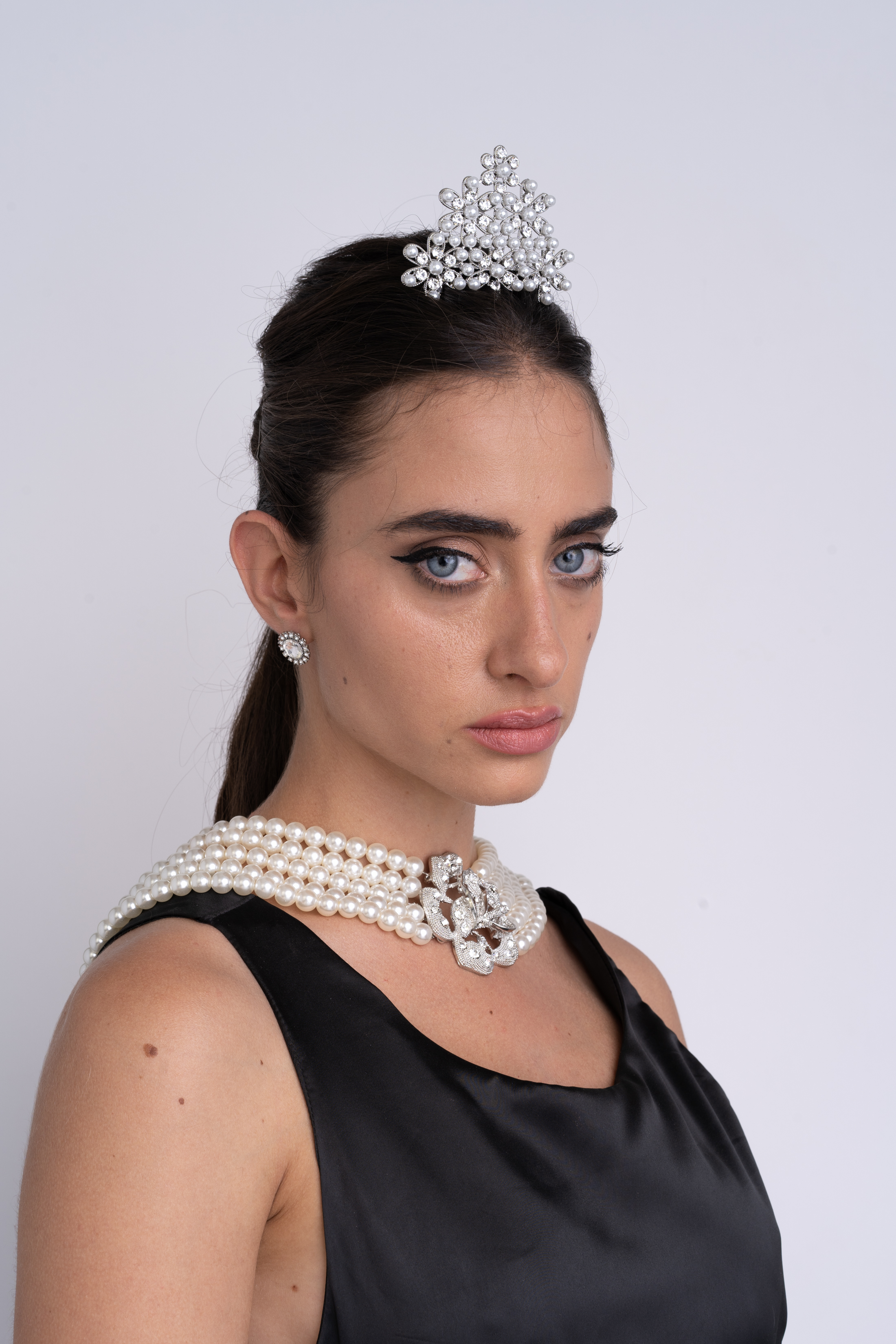 Add the style and grace of Audrey Hepburn as Holly Golightly with this stunning pearl tiara inspired by the iconic black dress attire as featured in the classic film Breakfast at Tiffany's.