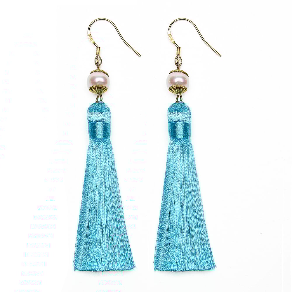 Now, meet the newest addition to our oh so pretty gold and pearl tassel earrings collection, aka the tiffany blue. Handmade with the same artisan details, these gorgeous tiffany blue tassel earrings feature fresh water pearls and 24k plated gold hooks are perfect for the most enticing dangle.