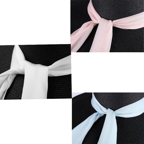 MIU Oversized Straw Holiday Black Hat With Silk Scarf Inspired By Audrey Hepburn