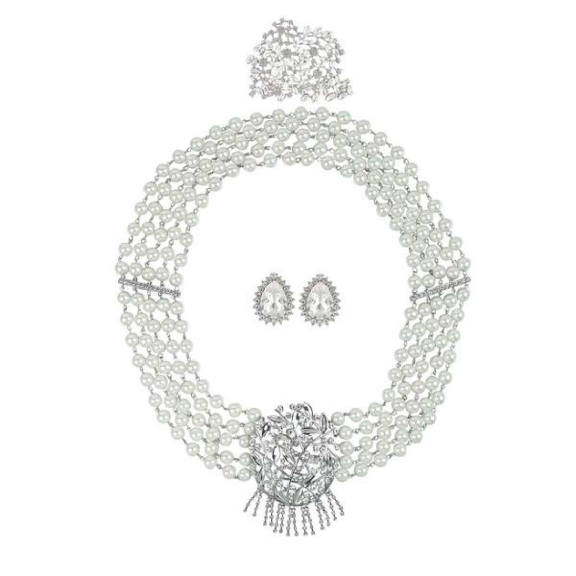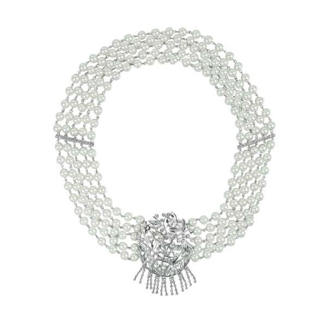 Incredibly complex, striking necklace features 5 strand of high quality man made pearls, and 100% crystal encrusted pendant and 2 attachment clips to ensure the necklace will stay in place when you are in motion.