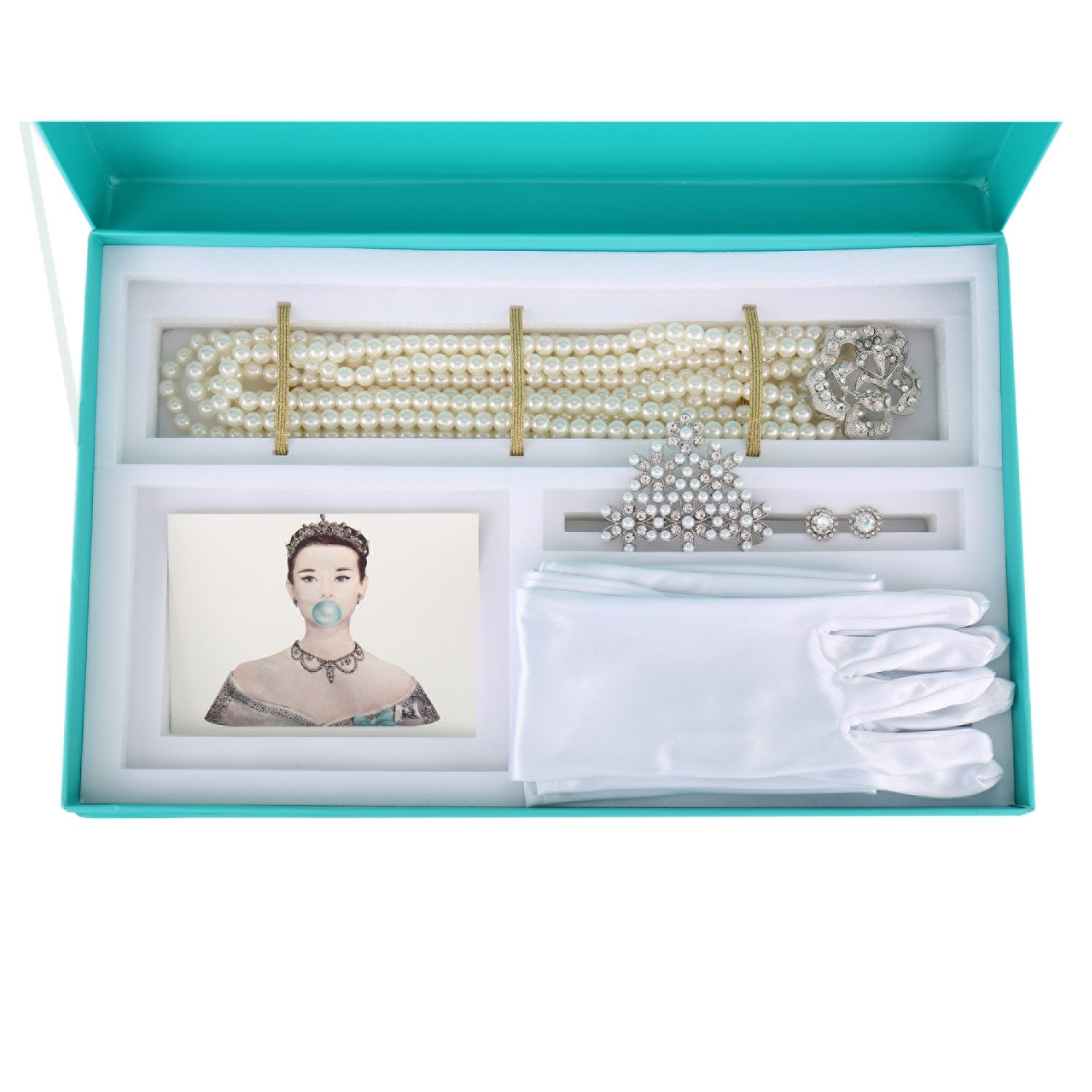 Add the style and grace of Audrey Hepburn as Holly Golightly with this stunning pearl tiara inspired by the iconic black dress attire as featured in the classic film Breakfast at Tiffany's.