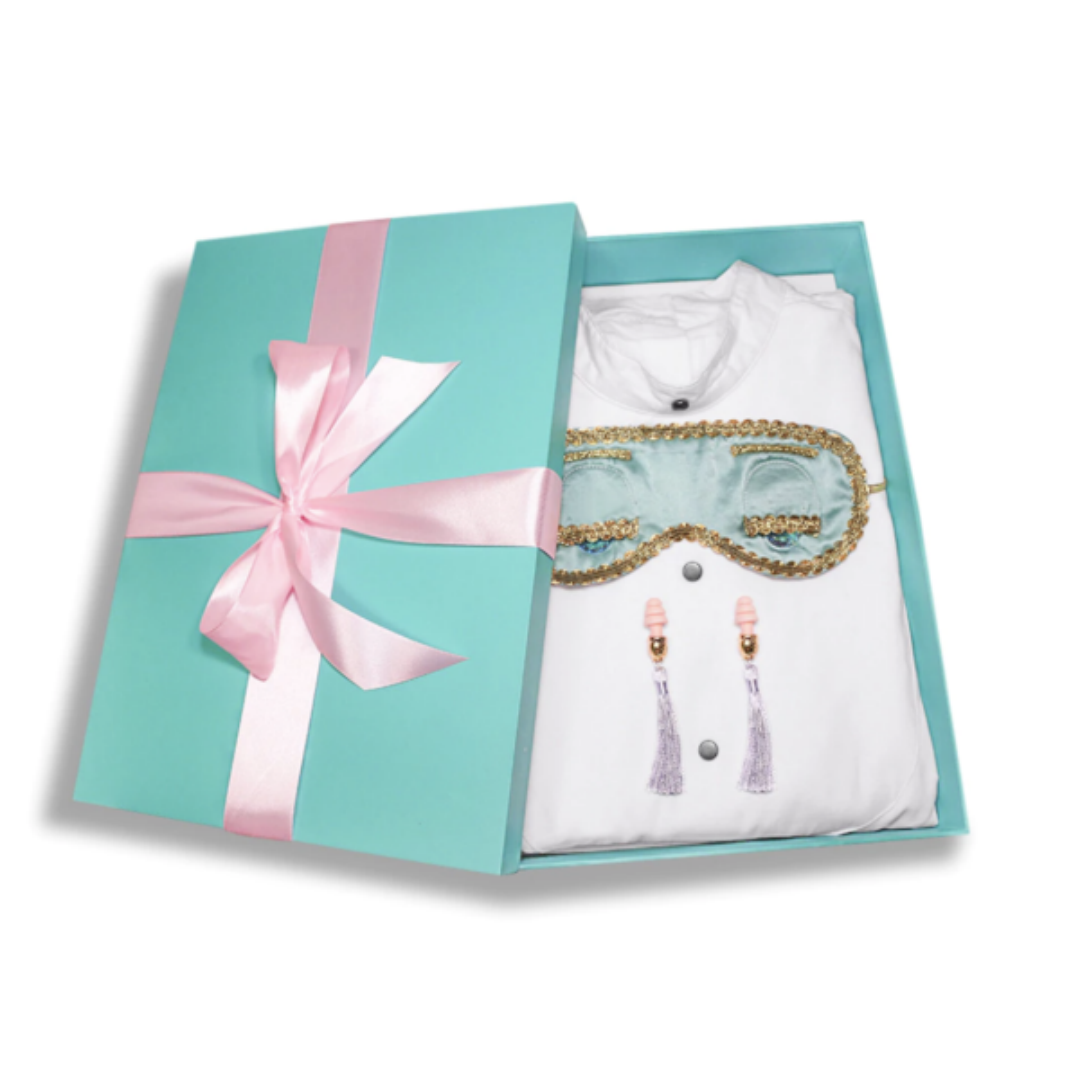 This 3-piece set comes complete with the signature tuxedo sleep shirt (handmade in 100% cotton) an exact replica of the version worn by the lovely Audrey Hepburn in Breakfast at Tiffany’s, especially made for the mini Audrey, Tiffany-inspired eye mask (handmade with 100% silk), and violet tassel ear plugs (handmade with swimmer grade rubber ear plugs). You will not find another replica that resembles the original assemble as much as this one. Perfect for that costume party or as a luxurious gift for that special Audrey girl in your life.
