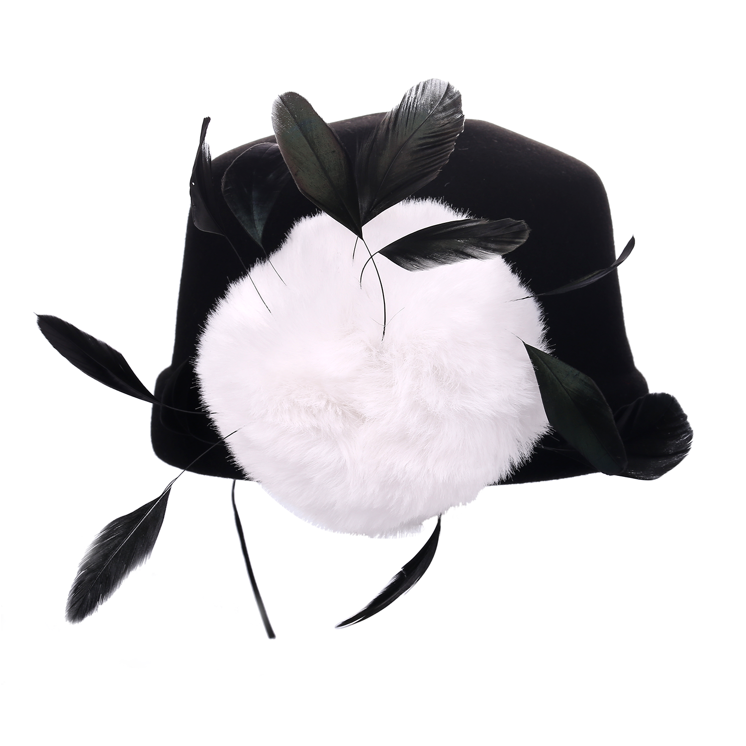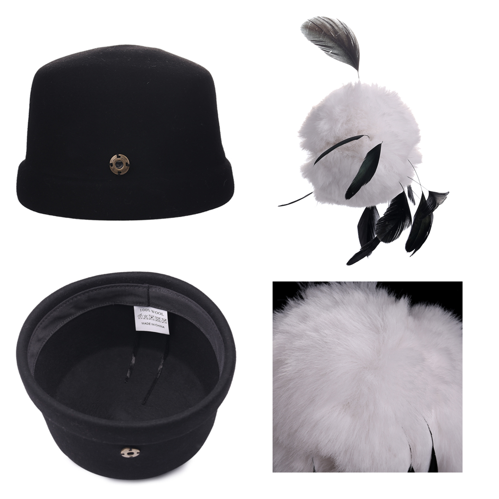 This timelessly chic hat is hand made with 100% natural wool and featuring vegan fur and duck feathers.